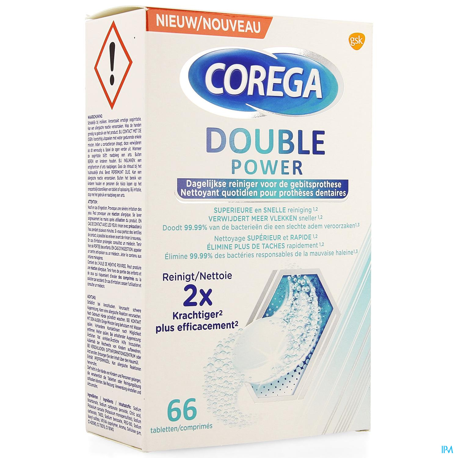 Tauchen Sie eine COREGA Double Power Tablette in eine Menge sehr heißes (aber nicht kochendes) Wasser, das ausreicht, um Ihre Teil- oder Vollprothese oder Ihre herausnehmbare Brücke abzudecken. Nachdem Sie die Prothese 5 Minuten lang eingeweicht haben, schrubben Sie die Prothese mit der Lösung und einer weichen Bürste. Spülen Sie Ihre Prothese gründlich unter fließendem Leitungswasser aus. Werfen Sie den Rest der Lösung sofort nach Gebrauch weg.