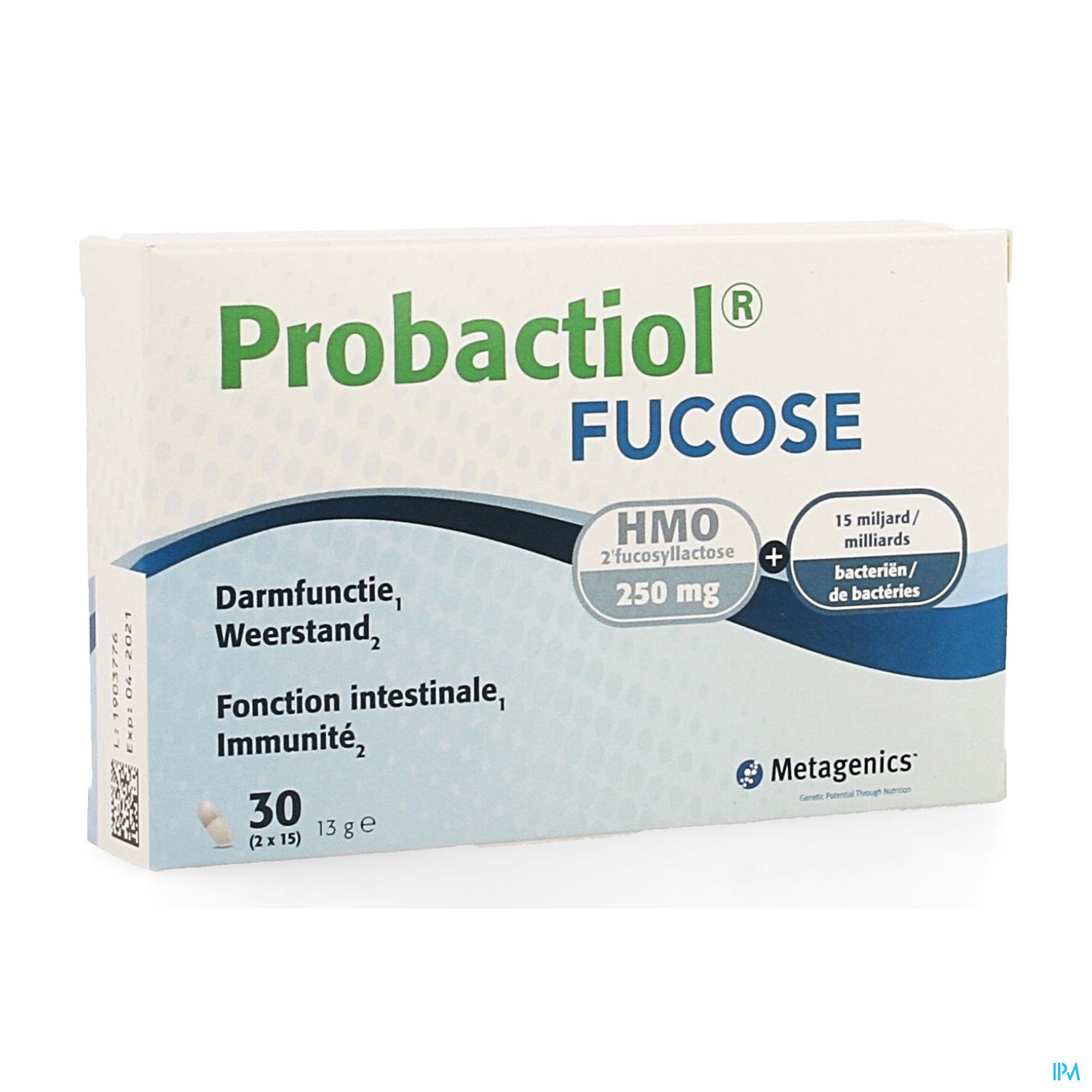Zusammensetzung 1 tägliche Einnahme von Probactiol Fucose: Blister 1: 2′-Fucosyllactose 250 mg, L-Threonin 100 mg. Blister 2: 15 Milliarden Bakterien (7,5 Milliarden L. acidophilus NCFM, 7,5 Milliarden B. lactis Bi-07), Vitamin D 2,5 ug