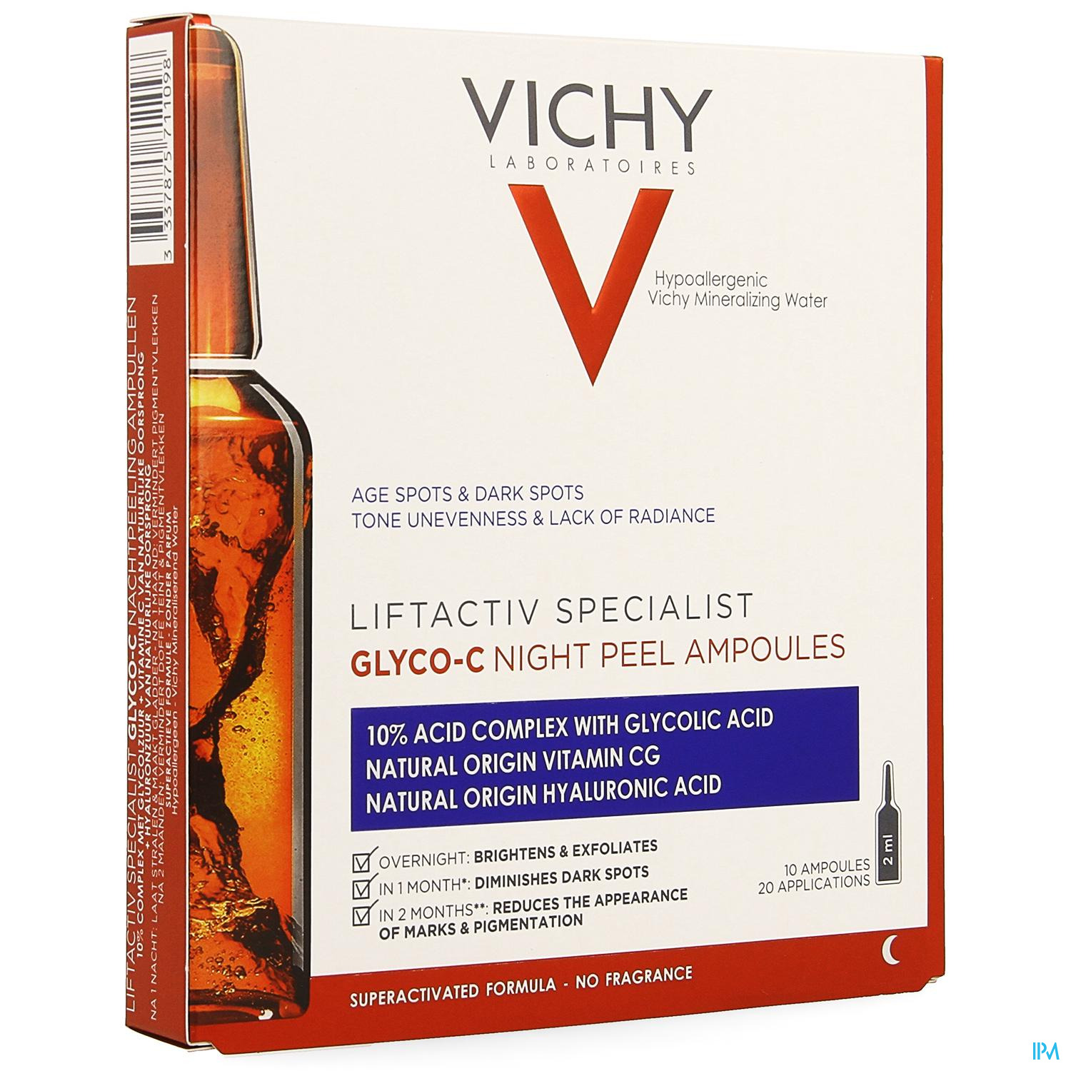 Eine Anti-Aging-Innovation in einem Ampullenformat, die auf verschiedene Arten der Hyperpigmentierung abzielt (dunkle Flecken, altersbedingte Pigmentflecken und Akne-Flecken). Vichy-Vulkanwasser ist mit 10% igem Glykolsäurekomplex, einem Referenz-Dermatologen gegen dunkle Flecken, und Vitamin Cg natürlichen Ursprungs angereichert. Klinisch nachgewiesene Wirksamkeit. Ohne Parfüm.